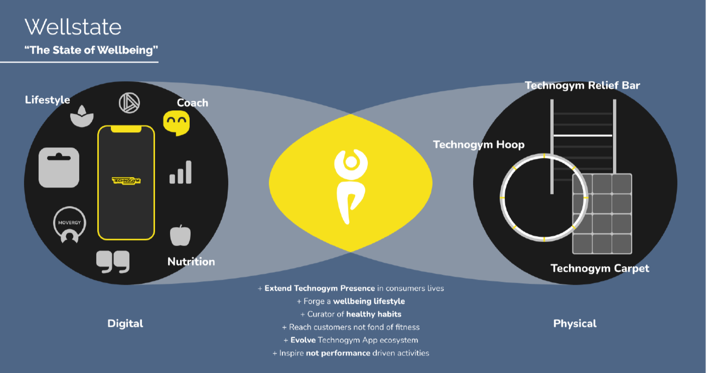 Wellstate is a concept that aims to encourage a new generation of consumers to embrace a wellness lifestyle while adapting to a post-COVID era through phygital solutions and experiences that fit into people's routines, extending Technogym's presence and stimulating new healthy habits.